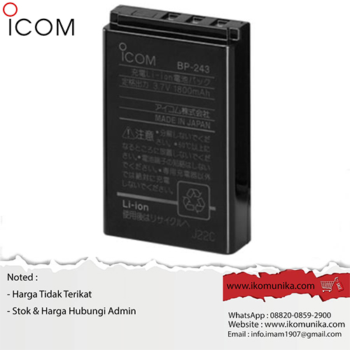 Baterai Icom BP–243 adalah baterai lithium ion 7.4V 1.6Ah. Baterai ini bisa digunakan untuk berbagai macam radio Icom, termasuk IC–F3021, IC–F3022, IC–F4021, IC–F4022, IC–F4023, IC–F5021, IC–F5022, IC–F5023, IC–F3161, IC–F3162, IC–F3261, IC–F3262, IC–F4161, IC–F4162, dan IC–F4261. Baterai ini juga bisa digunakan untuk Icom IC–V8, IC–V82, IC–U82, IC–U83, IC–T90A, IC–T90E, IC–T7A, IC–T7H, IC–T81A, IC–T81E, IC–T90A, IC–T90E, IC–F30GS, dan IC–F31GS.